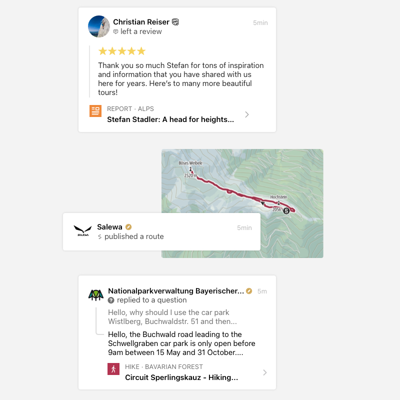 Connect with official organizations and other community membersConnect with your favourite organizations by following them on Outdooractive. Keep an eye on the routes and activities they publish, and ask them a question directly when you need some help with your own plans.